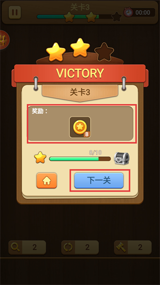 4、通關【關卡3】后出現【VICTORY】提示,獲得【8】金幣獎勵,點擊藍色的【下一關】按鈕進入后續連連看關卡。
