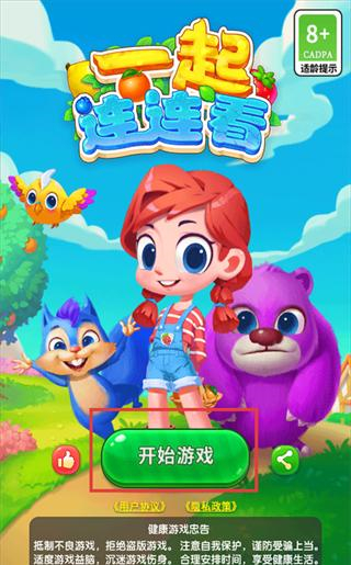 1、進入【一起連連看】的啟動界面,點擊綠色的【開始游戲】按鈕,即可開啟該連連看游戲的關卡挑戰。