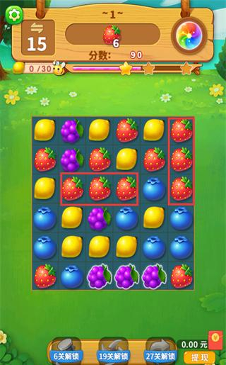 2、處于初始關卡界面,目標消除【草莓】等水果,匹配紅色框選的相同【草莓】方塊,積累【分數-90】推進關卡進度。