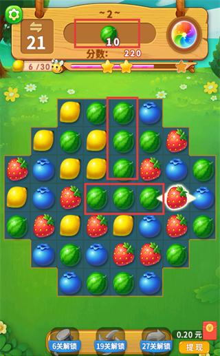 3、進入【關卡2】界面,目標消除【西瓜】,匹配紅色框選的相同【西瓜】方塊,提升【分數-220】以推進當前關卡進程。