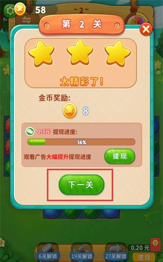 4、通關【第2關】后出現三星評價,獲得【8】金幣獎勵,點擊綠色的【下一關】按鈕,即可進入后續的連連看關卡。