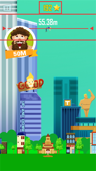 3、投擲角色后會飛躍城市建筑場景,留意【56.38m】的距離與【192】星星的積累情況。