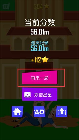 4、結算界面展示【當前分數-56.01m】,可選【再來一局】重玩,或看視頻獲取【雙倍星星】積累資源。