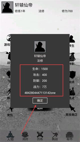 3、查看角色屬性面板確認生命、攻擊等數值后點擊【確定】,繼續進行修煉或挑戰玩法。
