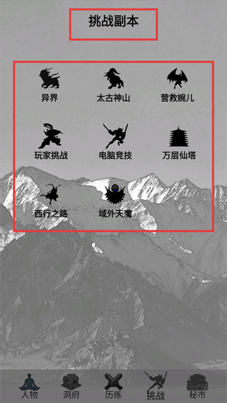 4、進入挑戰副本界面,選擇【異界】【太古神山】等副本進行挑戰,獲取資源提升修為與戰力。