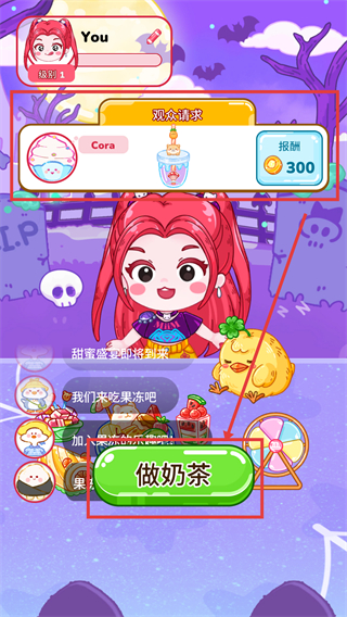 1、接取【觀眾請求】中【Cora】的需求,點擊【做奶茶】按鈕制作對應飲品,完成后可獲取【報酬-300】的獎勵。