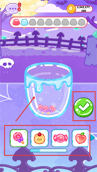 2、制作界面選擇下方道具(如棒棒糖)放入杯子,搭配完成后點右側【√】按鈕確認步驟。