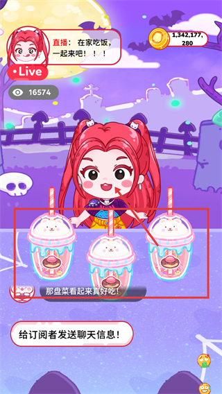 3、奶茶制作完成后,進入【Live】直播環節,展示做好的奶茶,還可點擊按鈕給訂閱者發送聊天信息推進互動。