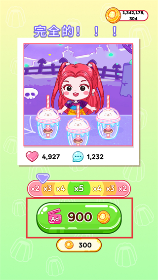 4、出現【完全的!!!】提示后,獲得【4,927】愛心與【1,232】消息,可選看【Ad】得【900】金幣,或直接領【300】金幣。