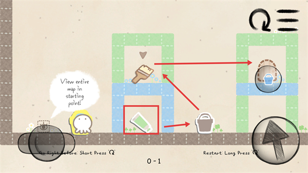 3、按照提示查看全圖,依據【0-1】關卡的操作說明移動,收集場景內的道具,留意按鍵操作規則。
