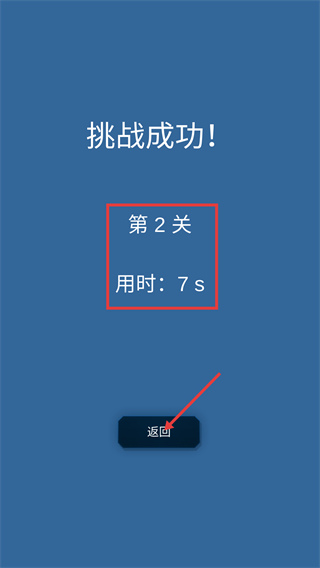 4、關卡完成顯示【挑戰成功!】后,查看【第2關】的【用時:7s】記錄,再點擊【返回】按鈕回到關卡選擇界面。