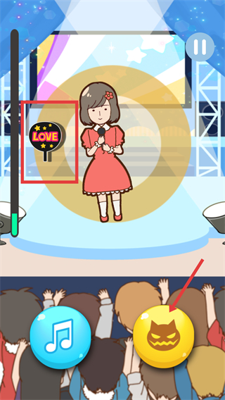 2、進入舞臺表演界面后,關注左側【LOVE】標識,點擊底部對應按鈕,可觸發舞臺相關互動效果。