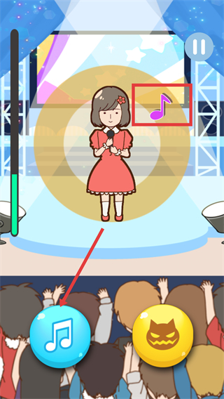 3、表演過程中點擊底部音樂按鈕,舞臺會出現【音符】標識,完成該互動可推進表演進程。