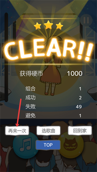 4、表演結束顯示【CLEAR!!】,可獲得1000硬幣,點擊【再來一次】可重新開啟舞臺表演挑戰。