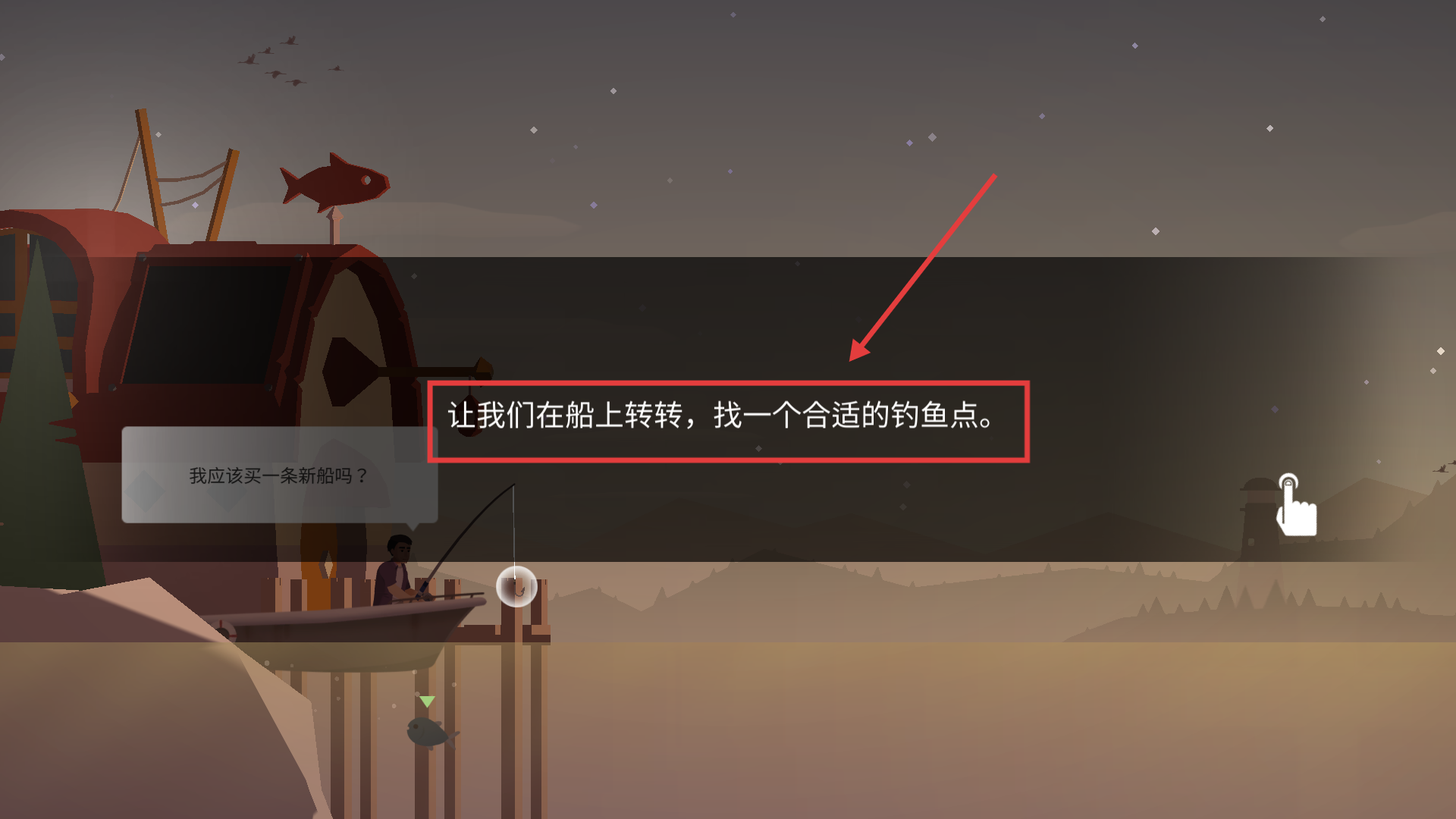 1、進(jìn)入游戲后滑動屏幕控制船只移動,仔細(xì)尋找【合適的釣魚點】,為后續(xù)垂釣做好準(zhǔn)備,提升釣魚的成功率。