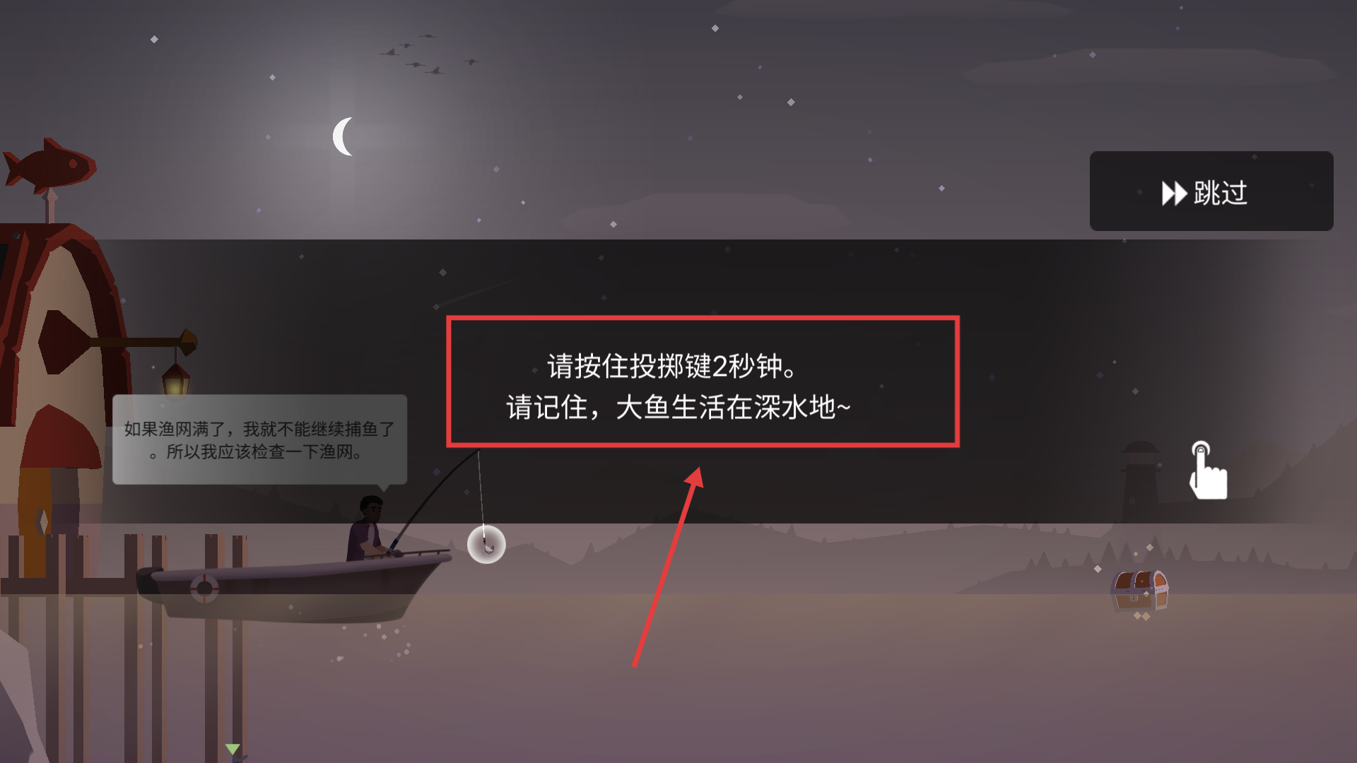 3、按住【投擲鍵】2秒鐘讓魚鉤深入水中,記住大魚多在深水區(qū)域,更容易釣到珍稀魚類,豐富你的收藏。