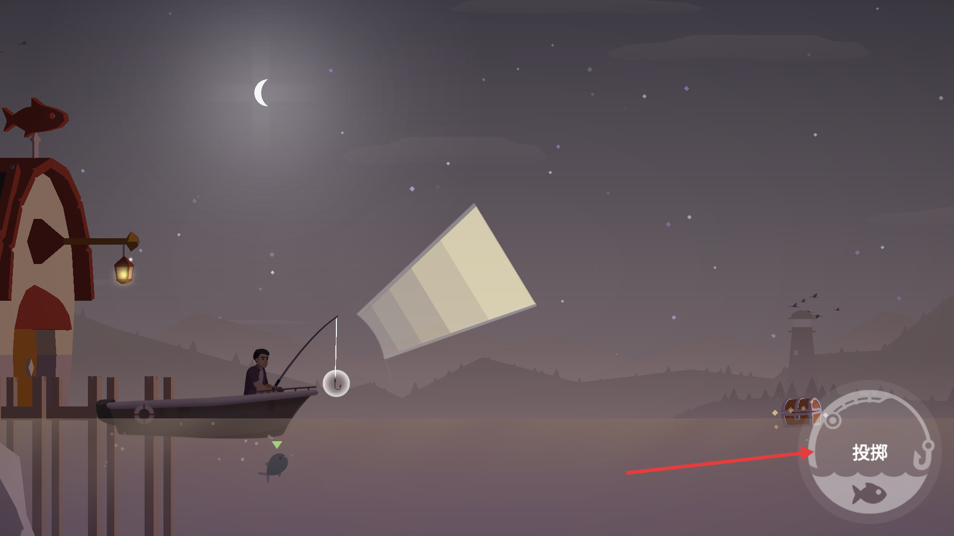 4、點擊【投擲】按鈕將魚鉤投出,盡量投到遠(yuǎn)處水域,擴(kuò)大垂釣范圍,提高釣到不同魚類的概率,體驗樂趣。