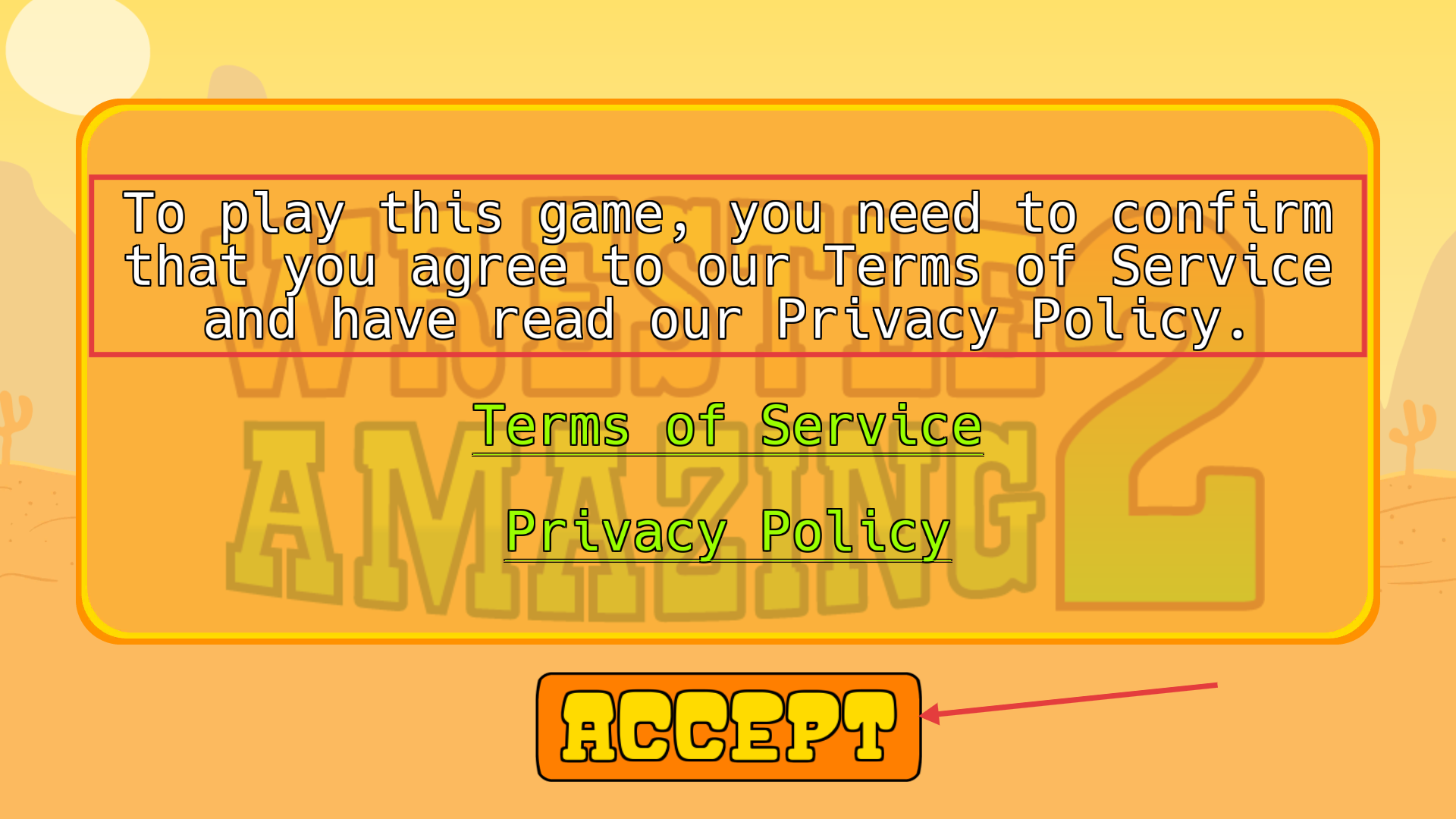 1、進入游戲前需點擊【ACCEPT】按鈕,同意【TermsofService】和【PrivacyPolicy】,這是開始游戲的必要步驟。