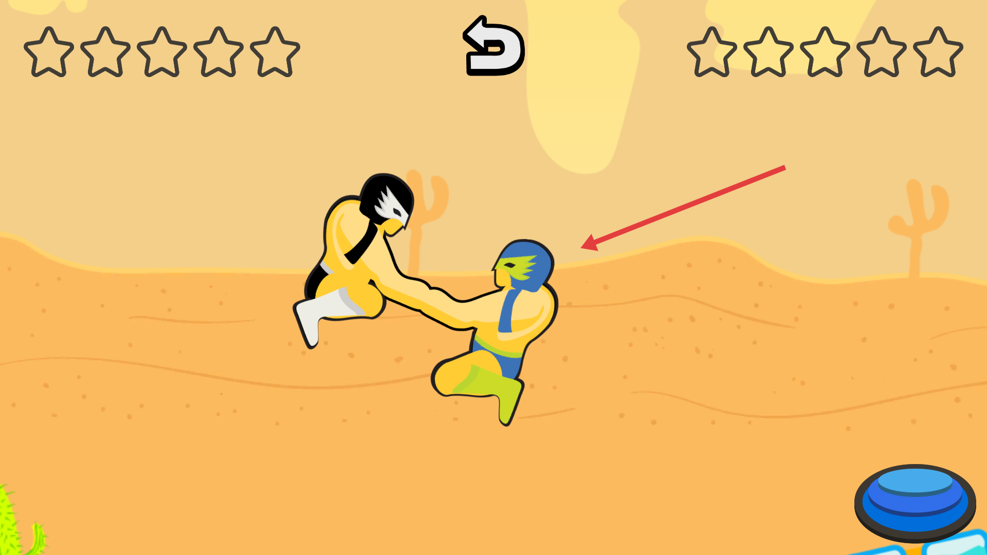 3、對戰時點擊藍色按鈕可讓角色腿伸直攻擊,需把握時機,推動對手頭部朝向地面。