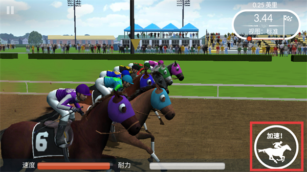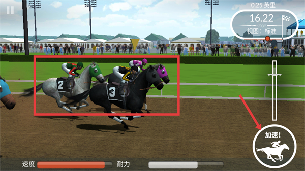 2、比賽中點擊右側【加速!】按鈕提升馬匹速度,同時留意【速度-耐力】條,平衡屬性維持沖刺狀態。