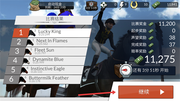 4、獲得【第1名】后,查看【比賽獎金-11275】,點擊【繼續】進入下一場賽事沖擊更好成績。