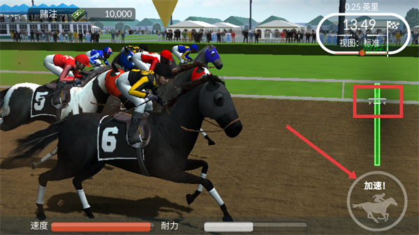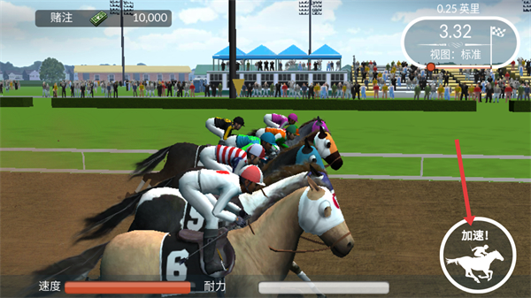 2、比賽開局點擊右側【加速!】按鈕提升速度,同時觀察【速度-耐力】條,平衡狀態保持沖刺節奏。