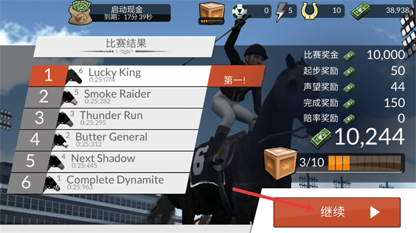 4、獲得【第1名】后,點擊【繼續】進入下一場賽事。