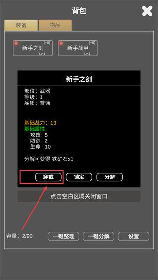 2、打開背包找到【新手之劍】-【新手戰甲】,點擊【穿戴】提升基礎戰力,讓前期刷怪升級更輕松高效。