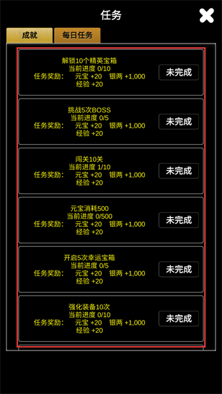 3、查看【成就】任務列表,完成【解鎖10個精英寶箱】等任務,獲取【元寶+20-銀兩+1000-經驗+20】獎勵。