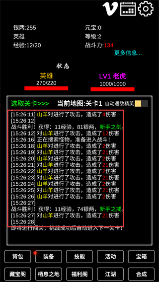 4、在【關卡1】開啟【自動遇敵精英】模式,擊殺怪物獲得【經驗-銀兩-裝備】,積累資源推動劇情發展。