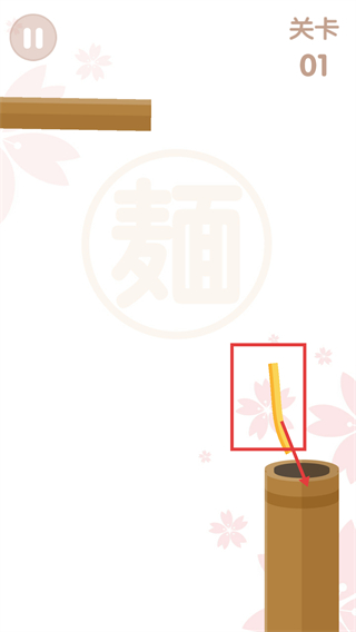3、定位紅框內的面條,調整竹筒位置使其落入筒中,完成該步驟的接面條操作,推進關卡01的進度。