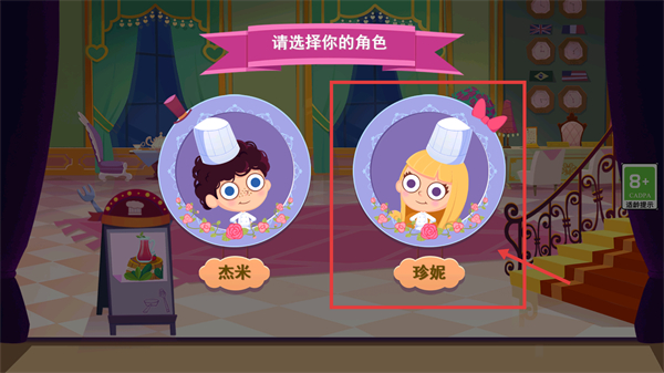 1、在【請選擇你的角色】界面,選擇【珍妮】進入游戲,開啟烹飪主題的關卡任務。