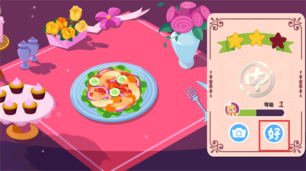 4、完成菜品制作后,獲得【2-顆星】評價,當前【等級1】,點擊【好】按鈕推進至后續的烹飪關卡。