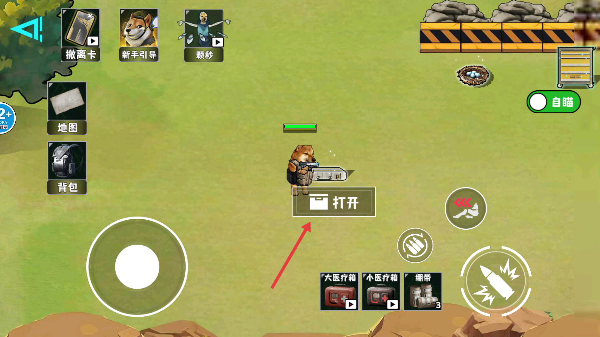 1、進(jìn)入場景后,找到可互動的箱子,點(diǎn)擊【打開】獲取物資,開啟【自動瞄準(zhǔn)】提升戰(zhàn)斗時(shí)的生存能力與效率。