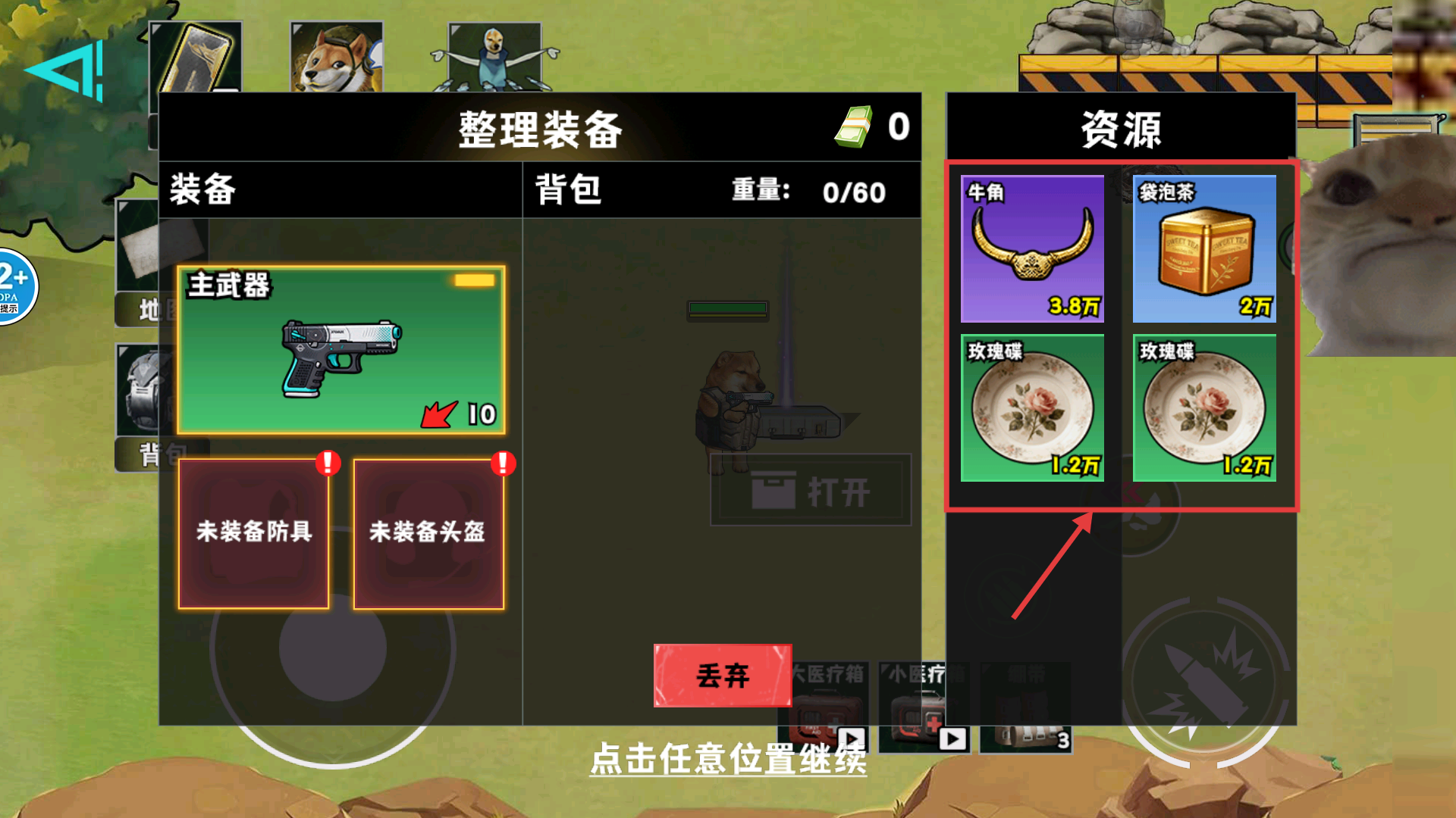 2、整理裝備界面中,優(yōu)先裝備【主武器】,合理存放【牛角】-【袋泡茶】-【玫瑰碟】等資源,確保背包重量不超限。