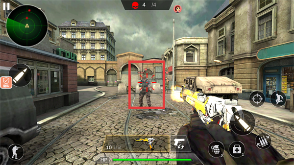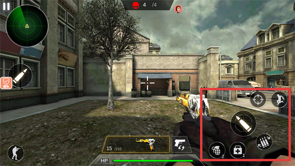 2、戰(zhàn)斗中用右側(cè)操控按鈕瞄準(zhǔn),切換武器或投擲道具,同時(shí)留意【HP】條維持生存狀態(tài)。