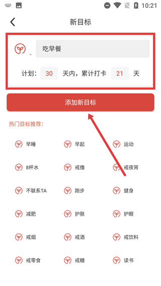 3、在新目標(biāo)頁(yè)面填寫(xiě)內(nèi)容,設(shè)置【30-天內(nèi)-累計(jì)打卡-21-天】的計(jì)劃后,點(diǎn)擊【添加新目標(biāo)】按鈕。