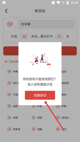 4、完成目標(biāo)添加后,點(diǎn)擊彈窗中的【創(chuàng)建成功】按鈕,即可確認(rèn)目標(biāo)創(chuàng)建并進(jìn)入激勵(lì)計(jì)劃。