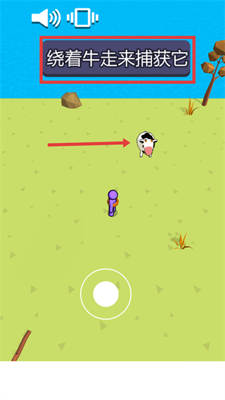 1、按照提示【繞著牛走來捕獲它】,操控角色移動,靠近目標奶牛,準備執行捕獲操作。