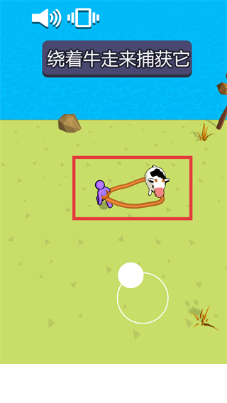 2、繞著奶牛移動,觸發捕獲道具的纏繞效果,將奶牛束縛,完成捕獲奶牛的核心步驟。