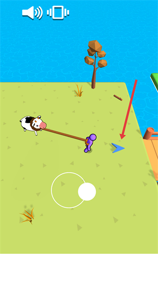 3、捕獲奶牛后,操控角色拖動奶牛,朝著界面中的【藍色箭頭】方向移動,推進流程。