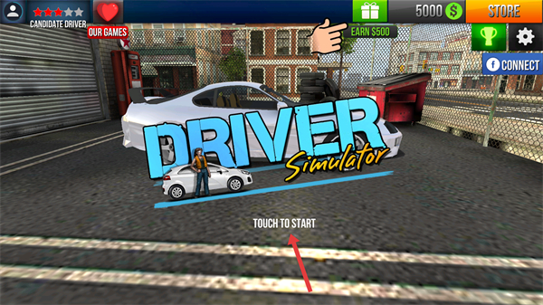 1、在游戲啟動界面,點擊“TOUCHTOSTART”區(qū)域,進入游戲的駕駛場景。