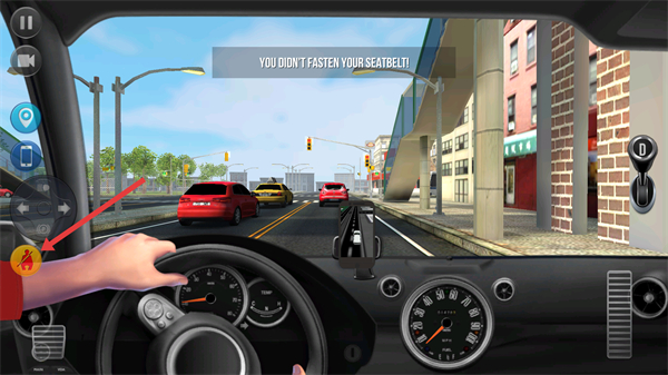 2、進入駕駛視角后,先處理界面提示,通過左側(cè)操作區(qū)域完成基礎(chǔ)準備,再用方向盤、方向鍵控制車輛在道路上行駛。