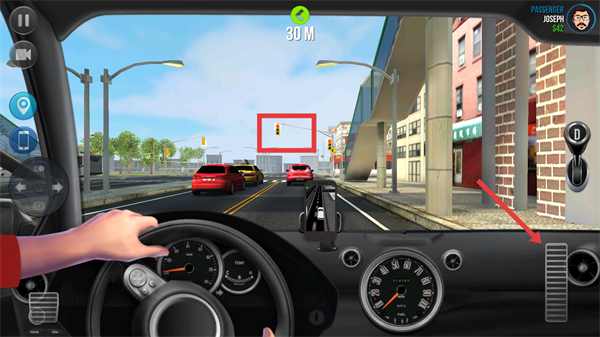 4、根據(jù)界面上方的導航提示(顯示“30M”),駕駛車輛前往目標位置,完成乘客的接送任務。