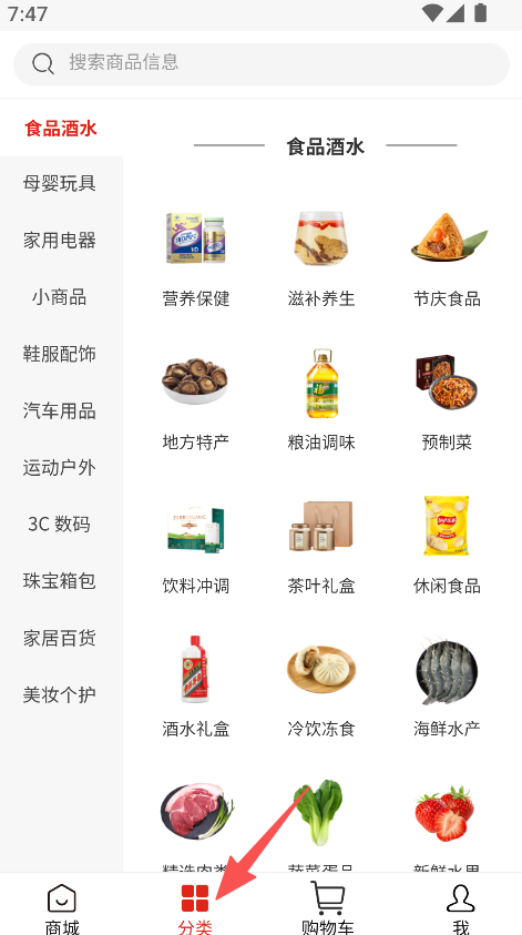 1、設有分類板塊功能,可進入分類頁面選擇食品酒水家用電器等不同類別的商品品類。