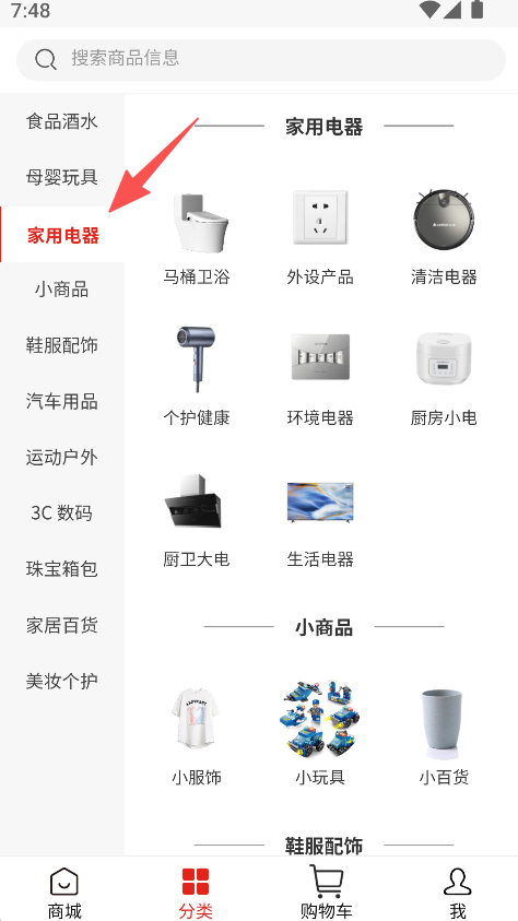 2、在分類頁選擇目標品類如家用電器,進入對應品類頁面。