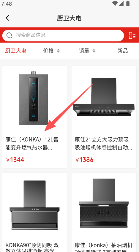 2、支持品類細分選擇功能,如在電器品類下選擇廚衛(wèi)大電,進入對應細分商品展示頁面。