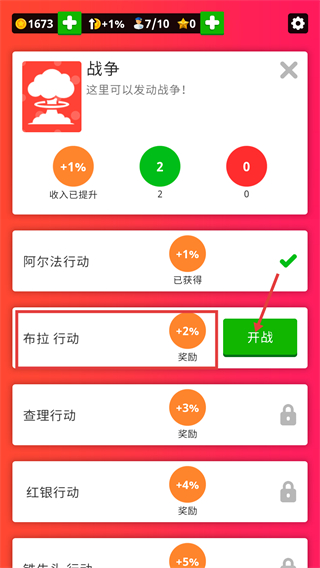 1、在【戰爭】界面,選定【布拉行動-+2%獎勵】,點擊【開戰】按鈕發起戰爭,當前【收入已提升-+1%】,推進該行動獲取獎勵。