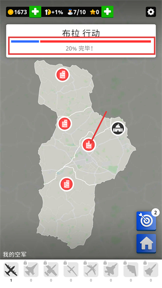 2、進入【布拉行動】后,進度顯示【20%-完畢】,依托【我的空軍】單位,逐步攻克地圖上的據點,推進行動進度。