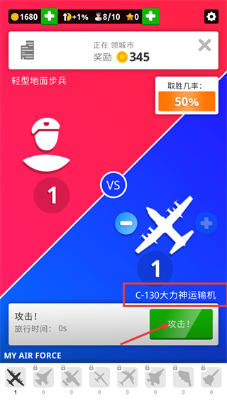 3、在領城市環節,使用【C-130大力神運輸機】作戰,當前【取勝幾率-50%】,點擊【攻擊!】按鈕發起對戰,爭奪城市獎勵。